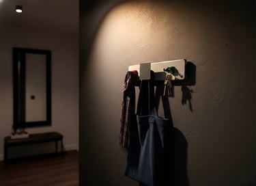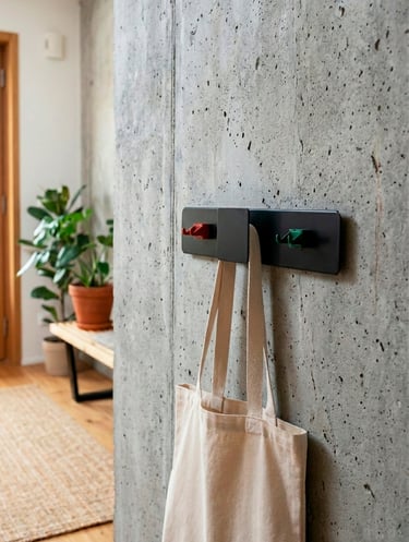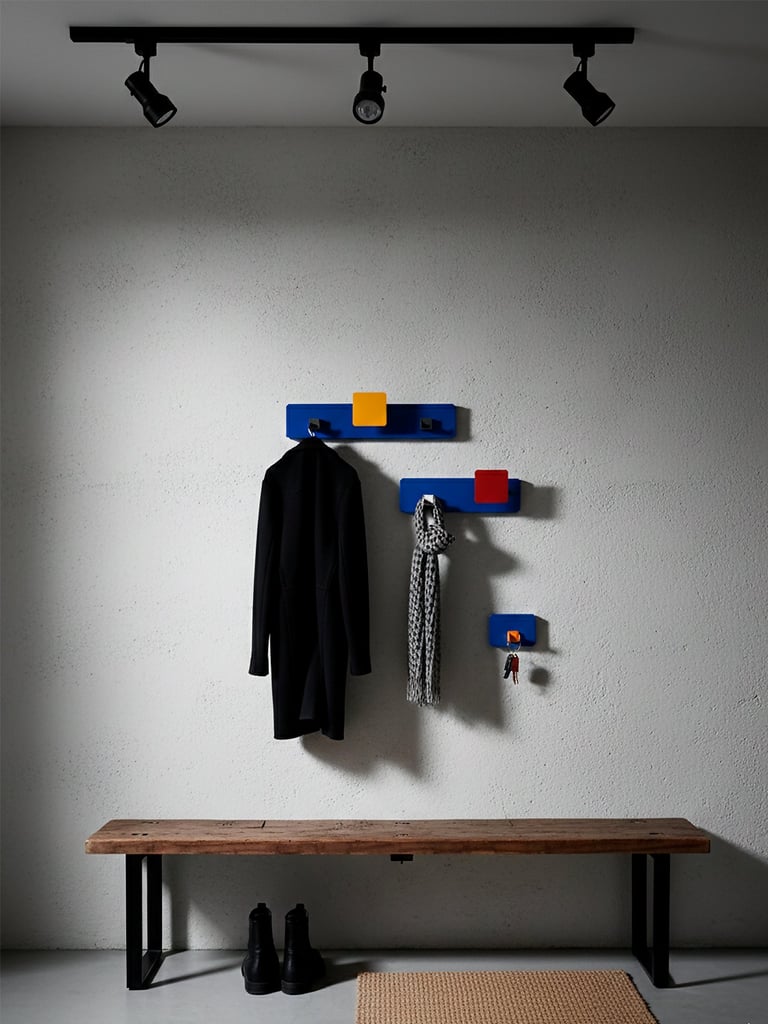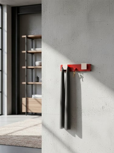 Serie de percheros de pared configurables, para accesorios de uso frecuente.